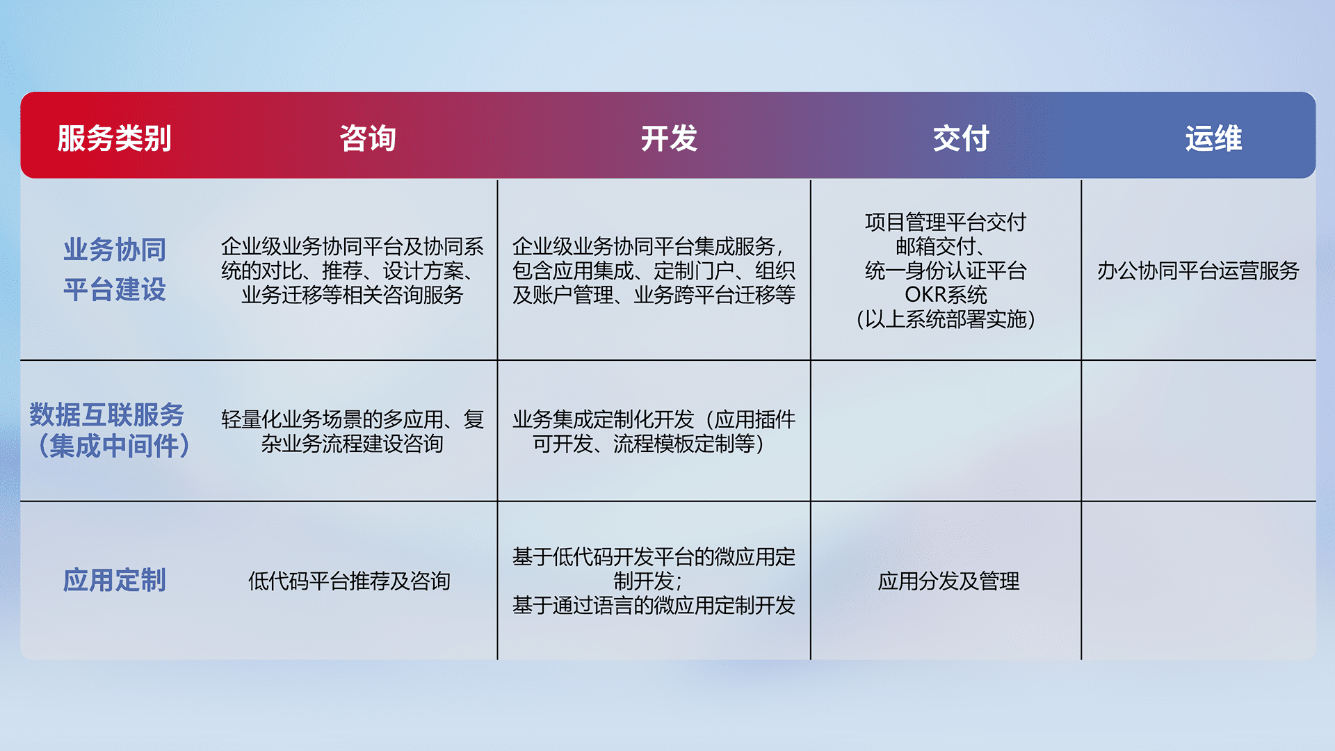 针对钉钉、、企微、、、IDaas等平台级产品提供产品的规划、、方案、、、交付、、定制化开发等服务,,,,实现如统一协同办公、、智能客户服务、、、混合会议管理、、智能数据查询、、等业务场景,,,,实现数字化转型。。